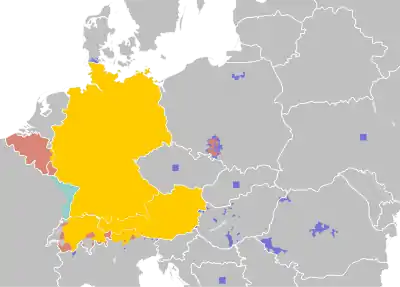 در اروپا و آسیا، زبان آلمانی زبان اقلیت به رسمیت شناختهشده در کشورهای زیر است: