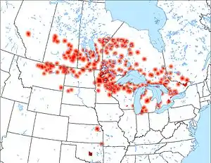 | منطقه | کانادا: استان کبک، انتاریو، منیتوبا، ساسکاچوان، گروههایی در آلبرتا، بریتیش کلمبیا؛ ایالات متحده: میشیگان، ویسکانسین، مینهسوتا، گروههایی در داکوتای شمالی، مونتانا |