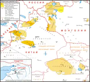 ![]() A map showing the distribution of Oirat outside Kalmykia. Varieties in dispute have not been included[2] | |||