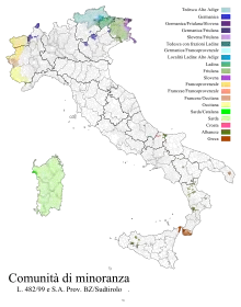 در ایتالیا، تقریباً همه زبانهای بومی و محلی، حتی اگر با ایتالیایی معیار کاملاً متفاوت و متعلق به شاخههای مختلفی باشند، بیشتر بهطور نادرست «گویشهای ایتالیایی» خوانده میشوند.[48] تنها استثنا در این مورد دوازده گروه «اقلیت زبانی تاریخی» هستند که طبق قانون رسماً به عنوان زبانهای اقلیت مجزا شناخته میشوند. از طرف دیگر، زبان کرسی (زبانی که در جزیره کرس فرانسه گویش میشود) ارتباط تنگاتنگی با توسکانی قرون وسطایی که ایتالیایی معیار از آن گرفته شده و تکامل یافتهاست، دارد.