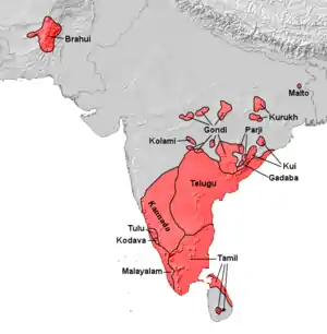 ![]() براهویی (سمت چپ بالا) از لحاظ جغرافیایی از تمام زبانهای دراویدی جدا شدهاست.[3] | |