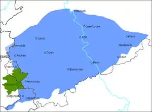 ![]() Area where Ripuarian is spoken. Green=sparsely populated forest. | |