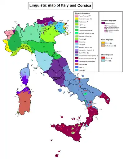 پراکندگی زبانها در ایتالیا؛ مناطقی که در آنها به زبان سیسیلی سخن گفته میشود، با رنگ بنفش مشخص شدهاست.