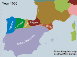 هنگامی که رومیها در سال ۲۱۶ پیش از میلاد به شبه جزیره ایبری رسیدند، زبان لاتین را که از آن همه زبانهای رومی ریشه گرفتهاند، با خود بدانجا آوردند. این زبان توسط سربازان رومی، شهرکنشینان و بازرگانان که شهرهایشان را بیشتر در نزدیکی شهرهای تمدنهای پیشین سلتی (مدتها پیش از ورود رومیان تأسیس شده بود) ساخته بودند، گسترش یافت. به همین دلیل، این زبان یک زیرلایه از فرهنگهای اروپای اطلسی خرسنگی[22] و سلتی[23] را در خود داراست.[24]