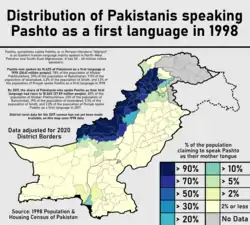 در پاکستان، پشتو زبان اول ۱۵ ٪ از جمعیت است (در سال ۱۹۹۸)،[52][53] پشتونها بیشتر در شمال غربی در ایالت خیبر پختونخوا و مناطق شمالی ایالت بلوچستان ساکنند. پشتو همچنین در بخشهایی از نواحی میانوالی و اتک در ایالت پنجاب، مناطقی از گلگت-بلتستان، در اسلامآباد و همچنین توسط جوامع پشتوزبان در شهرهای مختلف سراسر کشور به ویژه کراچی و حیدرآباد در سند، صحبت میشود.[37][54][55][56]