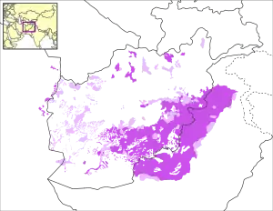 پشتو به عنوان زبان رسمی در افغانستان بیشتر در شرق، جنوب و جنوب غربی رایج است اما در برخی از مناطق شمالی و غربی کشور نیز صحبت میشود.[31] شمار دقیق گویشوران آن در دسترس نیست، اما برآوردهای مختلف نشان میدهد که پشتو زبان مادری ۳۵–۵۰٪ از کل جمعیت افغانستان است.[32][33][34]