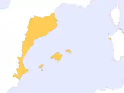 | آندورا، استانهای لریدا، نیمه غربی تاراگونا، لا فرانژا | بخش خودمختار والنسیا، کارچه | استانهای بارسلون، نیمه شرقی تاراگونا، بیشتر خیرونا | جزایر بالئاری | کاتالونیای شمالی | شهر آلگرو در ساردینیا | |