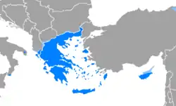 یونانی در یونان زبان رسمی است و توسط تقریباً همه جمعیت سخن گفته میشود.[10] یونانی همچنین در قبرس در کنار زبان ترکی استانبولی رسمی است.[11] به دلیل عضویت یونان و قبرس در اتحادیه اروپا، یونانی یکی از ۲۴ زبان رسمی این اتحادیه است.[12] یونانی همچنین زبان رسمی دو شهر در آلبانی و زبان اقلیت به رسمیت شناختهشده در کل کشور است.[13] در بخشهایی از ایتالیا، ارمنستان، رومانی و اوکراین نیز یونانی زبان محلی یا اقلیت شناخته میشود.[14] یونانیها در مجارستان نیز یک گروه قومی به رسمیت شناختهشده هستند.[15]
