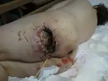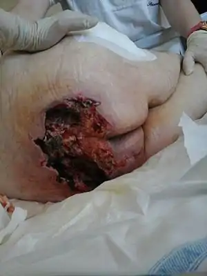 | زخم بستر درجه چهار در ناحیه استخوان خاجی. استخوان دنبالچه در میانه زخم دیده میشود. | |