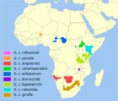 - آنگولنسیس: یا زرافهٔ آگولا یا نامیبیا. این زرافه در آنگولا، نامیبیا، غرب زامبیا، بوتسوانا و غرب زیمبابوه یافت میشود. مطالعات ژنتیکی نشان میدهد که گونهٔ نامیب که در شمال صحرای بزرگ آفریقا و پارک ملی اتوشا وجود دارد، گونهای جداگانه از اینگونه است.