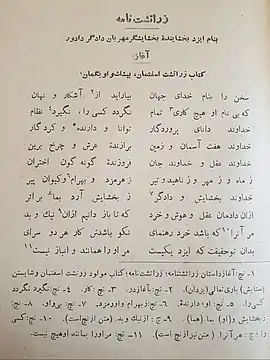 اما آثار زرتشت بهرام یکی زراتشتنامه است و موضوع آن معجزات پیش از زادن و زمان خردسالی زرتشت پیغمبر و داستانهایی از زندگانی وی و رسیدنش بهدرگاه کیگشتاسب و برتری و غلبه یافتن بر حکمای دربار این پادشاه و هزاره او و قیام هوشیدر و روی کار آمدن بهرام ورجاوند و پایان هزاره او است.
