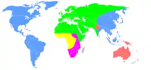 میشود گفت همه آسیای شرقی را تبار زرد در بر میگیرد. با تازش مغولان به دیگر سرزمینها پراکندگی آنها به آسیای غربی و اروپا هم کشید. همچنین کوچ مردمانی که امروزه سرخپوست خوانده میشوند در هزاران سال پیش به پراکندگی این تبار در قاره آمریکا یاری رساند. برخی از آنان در سدههای پیش حتی توانستند خود را به جزیرههای دور دست دو اقیانوس هند و آرام برسانند. در آفریقا این تبار تنها با آمیزش با سیاهپوستان ماداگاسکار توانست رخنه کند.