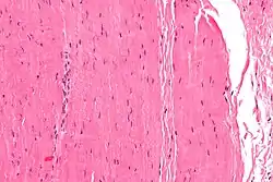 ![]() عکاسی ریزنگاری of a piece of تاندون. H&E stain. | |