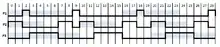 در نمودار زمانبندی، ستونها برش زمانی را نشان میدهند که با حرکت به سمت راست افزایش مییابند، و تمام فرایندها دورهٔ تناوب خود را از برش زمانی صفر شروع میکنند. رنگ سایههای آبی و سفید که تناوبی به دنبال یکدیگر در نمودار زمانبندی آمدهاند دوره تناوب فرایندها را نشان میدهند و ضربالاجل فرایندها برابر با زمان تغییر رنگ در نمودار زمانبندی میباشد. با مهلتهای تغییر رنگ.