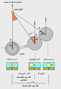 بعبارتی، مدت زمان واقعی که طول میکشد زمین به دور خودش بچرخد، ۲۳:۵۶:۴ است، اما در این مدت زمین هم کمی (حدود ۱درجه) در مدار انتقالی خود حرکت میکند. بنابراین خورشید در جای سابق خود دیده نمیشود ولی ستارگان به همان صورت دیده میشوند و ناچار زمین برای تمام شدن روز خورشیدی باید ۳ دقیقه و ۵۶ ثانیه دیگر حرکت کند؛ که در این صورت جای ستارگان متفاوت خواهد بود. به آن زمان کوتاهتری که در طی آن جای ستارگان تغییر نمیکند «شبانروز نجومی» میگویند.