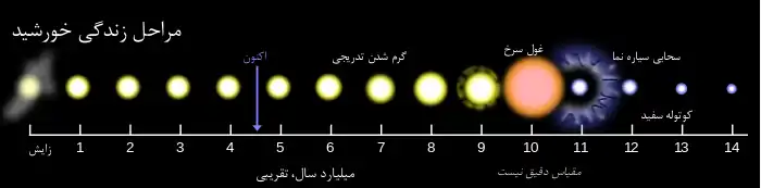خورشید نیز مانند دیگر ستارگان که دچار دگرگونی میشوند، پس از ۵ Gyr تبدیل به یک غول سرخ خواهد شد. بررسیها نشان دادهاست که در این هنگام شعاع خورشید ۲۵۰ بار بزرگتر از شعاع آن در عصر حاضر خواهد بود، چیزی نزدیک به ۱ AU یا ۱۵۰٬۰۰۰٬۰۰۰ کیلومتر.[80][81] در این هنگام سرنوشت زمین چندان روشن نیست. هنگامی که خورشید یک غول قرمز میشود ۳۰٪ از جرم خود را از دست میدهد. هنگامی که خورشید به بیشترین حجم خود رسیده زمین در مداری در ۱٫۷ AU یا ۲۵۰٬۰۰۰٬۰۰۰ km از آن قرار میگیرد. انتظار آن میرود که زمین پوشش خود را از دست بدهد و به دلیل بیشتر شدن پرتوهای خورشید در زمین (نزدیک به ۵۰۰۰ برابر مقدار کنونی) اگر نگوییم همه، بیشتر آنچه از حیات بر سطح آن باقیمانده از بین میرود.[82] یک شبیهسازی در سال ۲۰۰۸ نشان داد که هنگامی که خورشید یک غول بزرگ میشود مدار زمین به دور آن تنگتر شده و زمین به سوی خورشید کشیده خواهد شد تا آنکه وارد اتمسفر خورشید شده و بخار خواهد شد.[83]