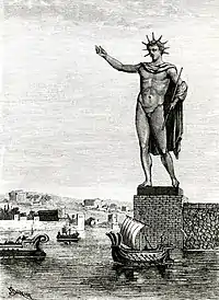 تندیس غول رودس پیش از سال ۲۵۰ پ. م و بهمنظور سپاسگزاری از خدایان برای نگهداری از شهر در برابر محاصرهٔ مقدونیها ساخته شدهبود. برخی نگارههای تاریخی این تندیس را در حالت گشادایستاده در ورودی بندرگاه نشان میدهند که با توجه به تکنولوژی ریختهگری برنز در آن زمان کاری تقریباً ناممکن بهنظر میآید.