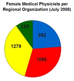زنان نزدیک به ۲۵٪ از متخصصین فیزیک پزشکی در جهان را تشکیل میدهند، و ۱۸٪ از رادیولوژیستهای حرفهای زن هستند.[2] این تعداد، در مقایسه، تعداد کمی میباشد[3]، و نیاز به سرمایه گذاری و سیاستهای ویژهای را نشان میدهد.[4] این اختلاف نه تنها در محیط بالینی، بلکه در محیط آکادمیک نیز یه چشم میخورد.[5]