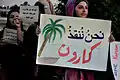 در فرایند تجمعات اعتراضی نسبت به انتقال آب کارون، مردم تجمعکننده در آرامش کامل با در دست داشتن پلاکاردهایی حاوی شعارهایی دربارهٔ مخالفت با اجرای طرح انتقال آب اعتراض خود را نشان دادند. این شعارها به دو زبان عربی و فارسی بود. «کلنا لِکارون»؛ «هوا را از من بگیر، کارون را نه»؛ «کارون خط الأحمر»؛ «کارون را نجات میدهیم»؛ «نطالب الحکومه به عدم بناء السدود»، «کلنا کارون»، «نحن معاک یا کارون»، «کارون، شاهرگ ایران زمین»، «بلروح بلدم نفدیک یا کارون»و… از شعارهایی بودند که در هنگام تجمع سر داده میشدند.[5]
