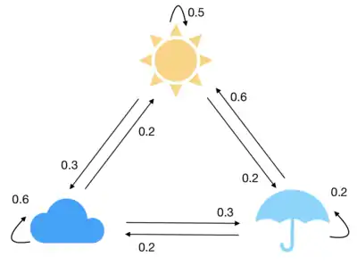 احتمال وضعیت آب و هوایی که آب و هوا در طول روز را نشان میدهد و هم به صورت بارانی و هم آفتابی مدل میشود، توسط یک ماتریس انتقال ارائه داده میشود. ماتریس P یک مدل آب و هوایی را نشان میدهد بهطوریکه روز بعد یک روز آفتابی، با احتمال %۹۰ آفتابی است و روز بعد یک روز بارانی، با احتمال %۵۰ آفتابی است. ستونها و سطرها با آفتابی و بارانی برچسبگذاری میشوند.