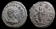 ![]() Zenobia Antoninianus coin reporting her title, Augusta and showing her diadem and draped bust on a crescent with the reverse showing a standing figure of یونو، holding a patera in her right hand, a sceptre in her left, a peacock at her feet, and a brilliant star to the right | |||||