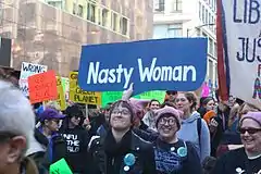 ![]() تظاهرکنندهای در راهپیمایی زنان تابلوی «زن کثیف» را در دست دارد، شیکاگو، ژانویه ۲۰۱۷ | |