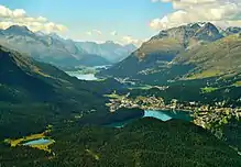 نمایی از دره انگادین که در آن دریاچه شتاتس، شهر سنت موریتز، زیلواپلانا و زیلس نمایان هستند.