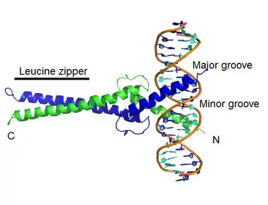 یک دایمر bZIP متصل به بخشی از دیانای - هر مارپیچ آلفا نمایندهٔ یک مونومر است.
