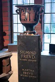 سه روز بعد از مرگ فروید، جسد او در شمال لندن سوزانده شد. سخنرانی مراسم تشییع جنازه توسط ارنست جونز و نویسندهٔ اتریشی، اشتفان تسوایگ ایراد شد بعدها خاکستر فروید به پایهای که توسط پسرش ارنست برای گلدان عتیقهای که فروید از پرنس بناپارت دریافت کرده بود و آن را سالها در اتاق مطالعه خود در وین داشت طراحی شده بود تبدیل شد بعد از اینکه همسر فروید در سال ۱۹۵۱ مرد خاکستر او هم در این گلدان گذاشته شد.[25]