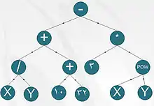 همانطور که در شکل فوق نیز میبینید، تمام عملگرها و توابعی که پارامتر به عنوان ورودی دریافت میکنند در ریشه زیردرختها قرار میگیرند و متغیرها، ثابتها، و توابعی که پارامتر به عنوان ورودی دریافت نمیکنند، در برگها قرار داده میشوند. گرههای ریشه که به هیچ چیز دیگری بستگی ندارند و فرزند نیز ندارند، اصطلاحاً پایانه(Terminals) نامیده میشوند.