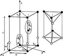 که c و a ثوابت شبکه ی بلور و u یک ثابت بی بعد می باشد.نقاط و با یک نوع اتم اشغال شده اند و و نیز توسط یک نوع اتم دیگر پر شده اند.هر اتم با یک چهار وجهی (معمولا) منتظم از اتم های نوع مخالف خود در بلور احاطه شده است. در صورتی که مقدار نسبت a/c تقریبا برابر با 1.633 باشد و ثابت u برابر با 3/8 باشد، بلوک های چهار وجهی منتظم خواهند بود.برای مثال اتمی که در موقعیت قرار دارد، توسط چهار اتم همسایه ی نزدیک به خود(که با اتم همنوع نیستند) و در موقعیت های ، ، ، قرار دارند، احاطه شده است. این چهار موقعیت ذکر شده تشکیل یک چهار وجهی منتظم می دهند و اتم موجود در در مرکز این چهار وجهی قرار خواهد داشت اگر بوده و شرایط زیر نیز برقرار باشد: