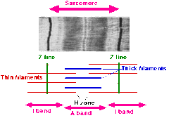 هر میوسیت (سلول عضلانی) یا تار یا میون شامل میوفیبریل (تارچه) هاست که زنجیرههای بسیار طولانی از سارکومرها هستند.سارکومرها واحدهای انقباضی سلول میباشند. یک سلول از عضله دو سر بازو (یک نوع عضله اسکلتی یا مخطط) ۱۰۰٬۰۰۰ سارکومر دارد. میوفیبریلهای سلولهای عضلانی صاف به شکل سارکومر سازماندهی نشدهاند اما ساختار میوفیبریلها در عضلهٔ قلبی مانند عضله اسکلتی از سارکومر است. سارکومرها از رشتههای نازک و ضخیم تشکیل شدهاست. رشتههای نازک از فیلامانهای اکتین تشکیل شدهاند، در حالی که رشتههای ضخیم از پروتئین های میوزین ساخته شدهاند. سارکومرها اندامک یا هسته ندارند. در سارکومرها دو نوار I (روشن) و A (تیره) وجود دارد که به علت آرایش منظم میوفیلامنتهای ضخیم و نازک (به ترتیب متشکل از میوزین و اکتین) بدین شکل درآمدهاست.