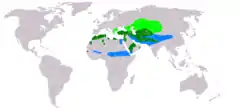 | سبز روشن: منطقهٔ تولیدمثل، آبی: تنها زمستان، سبز تیره: همیشگی. | |