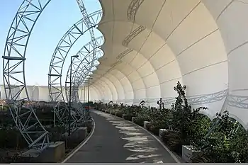 - طراحی و ساخت سازه: بخش دیگری از سازههای پارچه ای، عناصری هستند که وظیفهٔ انتقال بار غشا به فنداسیون و سپس زمین را برعهده دارند. این عناصر بهطور عمومی سازه نامیده میشوند. سازهها در این سیستم به صورت دیرک های خارجی، کابلهای معلق و دیرک های داخلی هستند.