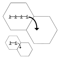 شکل۳- این شکل تا حدودی ایده تجمع نابجاییها و تأثیر آن بر استحکام ماده را نشان میدهد. یک ماده با اندازه دانه بزرگتر میتواند نابجاییهای بیشتری را جمع کند که باعث ایجاد نیروی مقاوم بزرگتری برای نابجاییها در برابر حرکتشان از یک دانه به دانه دیگر میشود. بدین ترتیب، نیروی کمتری برای به حرکت درآوردن نابجایی از دانه بزرگ، نسبت به همین نیرو در دانه کوچک، نیاز است که این نتیجه را میدهد که: مواد با دانههای کوچکتر، تنش تسلیم بالاتری نشان میدهند.