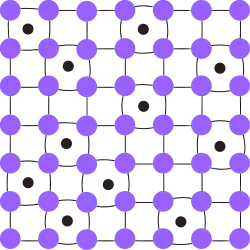شکل۱- این شکل نشان میدهد که چگونه شبکه با اضافه کردن محلول جامد تحت فشار قرار میگیرد. محلول بینابینی میتواند برای مثال، کربن در آهن باشد. اتمهای کربن در محلهای بینابینی شبکه نواحی استرس ایجاد میکنند که مانع از حرکت نابجاییها میشود.