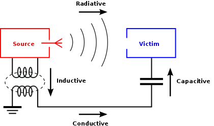 - تداخل فرکانس رادیویی (RFI)، از نوع معمولاً ۲۰ کیلوهرتز تا یک حد بالایی که با حرکت فناوری به سمت جلو، دائماً افزایش مییابد. منابع عبارتند از: