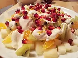 ![]() بشقاب سالاد میوه گلابی، satsuma mandarin، کیوی، میوه گلساعتی، انار و ماست چکیده مخلوط با عسل، هل سبز و شکر وانیلی | |