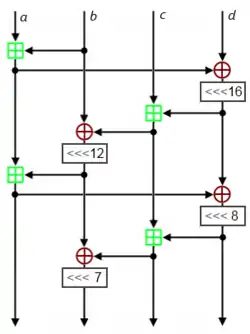 ![]() تابع ربع دور ChaCha. چهار نسخه کپی موازی تشکیل یک دور میدهند. | |