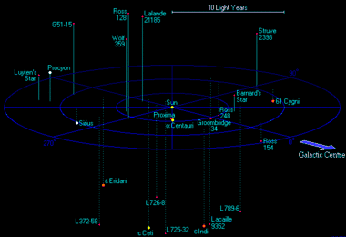 ![]() این نقشه نمایانگر ستارههایی واقع در ۱۲٫۵ سال نوری از خورشید ماست. | |