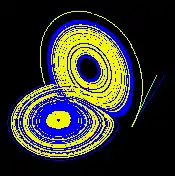 | این ارقام - ساخته شده با استفاده از ρ = ۲۸، σ = ۱۰ و β = ۸/۳ - سه بخش زمانی از تکامل 3-D دو مسیر را نشان میدهد (یکی به رنگ آبی، دیگری به زرد) در جاذب لورنتس با شروع از دو اولیه نقاطی که فقط با ۵-۱۰ در مختصات x متفاوت هستند. در ابتدا به نظر میرسد که این دو مسیر همزمان هستند (فقط یک زرد دیده میشود، زیرا روی یک مسیر آبی کشیده شدهاست) اما پس از مدتی واگرایی واضح است. | ||