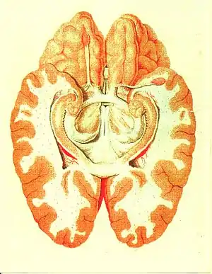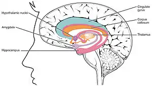 ![]() مقطع عرضی مغز انسان که بخش هایی از سامانه لیمبیک، از نمای زیرین در آن نشان داده شده است. | |