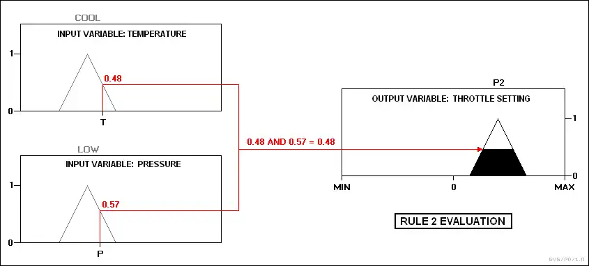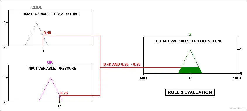 در عمل کنترلکننده ورودیها و نقشه آنها را در توابع عضویت مقادیر حقیقی میپذیرد. سپس این نقشه بندیها به داخل دستور وارد میشوند. اگر دستورهای خاص یک AND رابطه بین نقشه (طراحی) بین دو متغیر ورودی را مشخص میکند به عنوان مثال حداقل دو مورد از مقادیر حقیقی ترکیبی استفاده میشود. اگر یک OR مشخص باشد، از حداکثر استفاده میشود. این حالت خروجی مناسب انتخاب میشود؛ و یک مقدار ویژه حقیقی را به خود اختصاص در سطح پیش فرض دادهاست. ابتدا مقادیر حقیقی است و سپس دیفازیکیشن میشود. برای مثال فرض کنید درجه حرارت در وضعیت سرما قرار دارد و فشار در حالت کم و خوب است. از مقادیر فشار اطمینان حاصل میشود که تنها قوانین ۲ و ۳ گرما است.