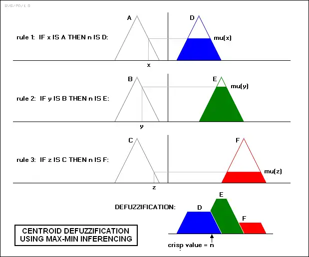 نمودار زیر ماکزیمم defuzzification را برای یک سامانه با ورودیهای متغیر x و y و z و یک خروجی متغیر n است. توجه داشته باشید که mu یک استاندارد منطق فازی برای مقادیر حقیقی است.