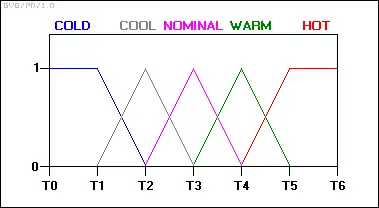 _______________________________________________________________________ -1 -0.75 -0.5 -0.25 0 0.25 0.5 0.75 1 _______________________________________________________________________ mu(LP) 0 0 0 0 0 0 0.3 0.7 1 mu(SP) 0 0 0 0 0.3 0.7 1 0.7 0.3 mu(ZE) 0 0 0.3 0.7 1 0.7 0.3 0 0 mu(SN) 0.3 0.7 1 0.7 0.3 0 0 0 0 mu(LN) 1 0.7 0.3 0 0 0 0 0 0 _______________________________________________________________________ —or, in graphical form (where each "X" has a value of 0.1):