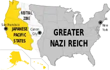 ایالات متحده به سه بخش تقسیم شده: بخش ژاپنی پسیفیک در غرب نازی رایش بزرگتر در شرق و کوههای راکی متحده (یا منطقه خنثی) در وسط، که در شروع برنامه نشان داده میشود.[1]