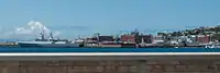 View of the harbour with the civilian yacht moorings in the foreground and the naval base to the right in the background.