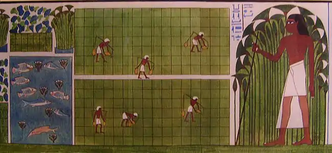 باغهای مصر باستان سمبل تولد دوباره بودند. نقاشی مقبره باغهای آمون در معبد کارناک، از مقبره نخ، باغبان اصلی. اوایل قرن ۱۴ قبل از میلاد.