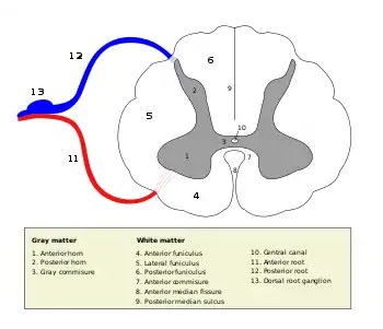 ![]() مقطع طناب نخاعی. سه ستون خاکستری، ناحیه سایه زدهی پروانهای شکلی را تشکیل می دهند. | |