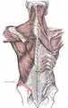 Muscles connecting the upper extremity to the vertebral column. Left iliac crest is labeled in red.